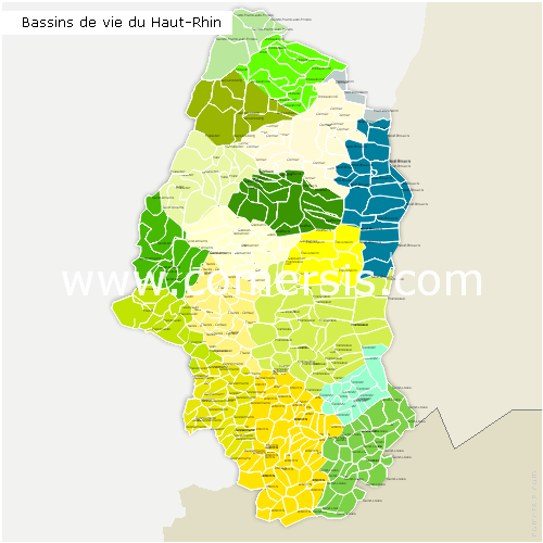 Carte administrative des 17 bassins de vie et des 366 communes du Haut-Rhin pour l'infographie, l'édition et l'impression grand format.