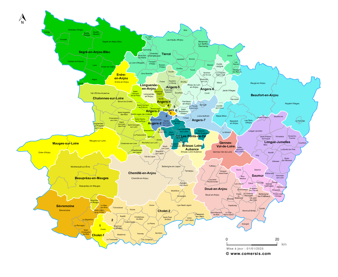 Tuffalun, Baugé-en-Anjou, Beaufort-en-Anjou, Beaupréau-en-Mauges, Blaison-Saint-Sulpice, Brissac Loire Aubance, Bellevigne-les-Châteaux , Chenillé-Champteussé, Orée-d'Anjou, Les Hauts-d'Anjou , Terranjou, Chemillé en Anjou, Doué-en-Anjou, Les Bois-d'Anjou, Ingrandes-le-Fresne-sur-Loire, Jarzé-Villages, Les Garennes sur Loire, Huillé-Lézigné , le Lion-d'Angers, Val d’Erdre-Auxence, Mazé-Milon, Longuenée-en-Anjou, Montrevault-sur-Èvre, Morannes sur Sarthe-Daumeray, Noyant-Villages, Mauges-sur-Loire, Ombrée d'Anjou, Gennes-Val-de-Loire, Val-du-Layon, Saint-Léger-de-Linières , Sèvremoine, Loire-Authion, Verrières-en-Anjou, Segré-en-Anjou Bleu, Bellevigne-en-Layon, Erdre-en-Anjou, Lys-Haut-Layon et Rives-du-Loir-en-Anjou .