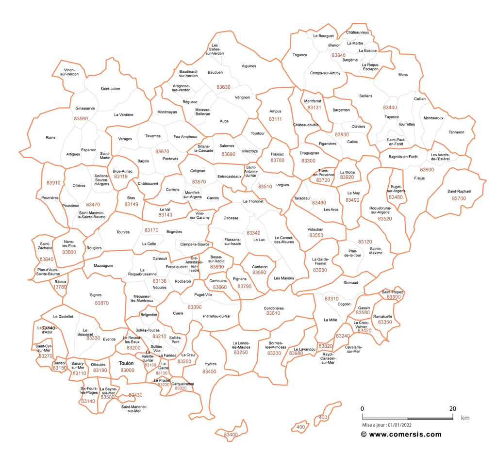 regroupe les communes en 70 zones postales avec leur identifiant.