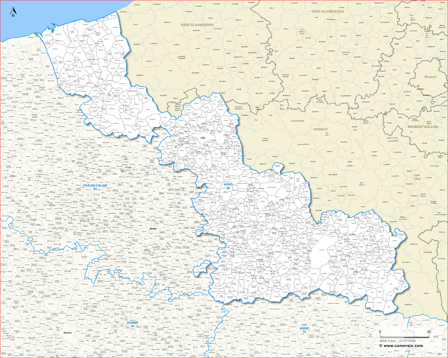 Carte personnalisable des communes du Nord et des communes limitrophes, pour l'infographie, l'édition et l'impression grand format.