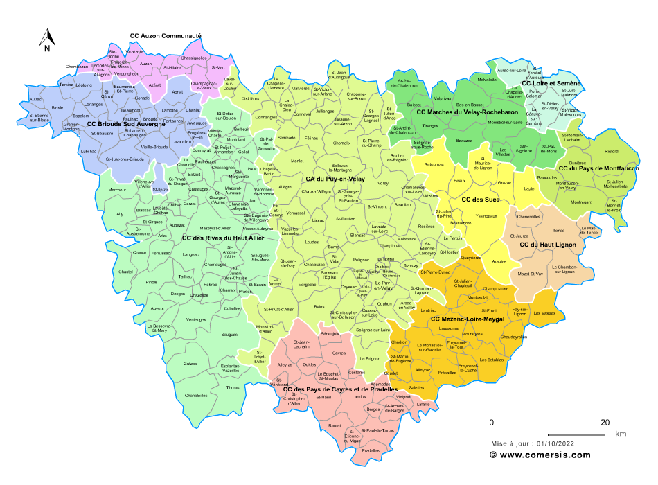 Carte administrative des communes et des 11 intercommunalités de la Haute-Loire pour l'infographie, l'édition et l'impression grand format.