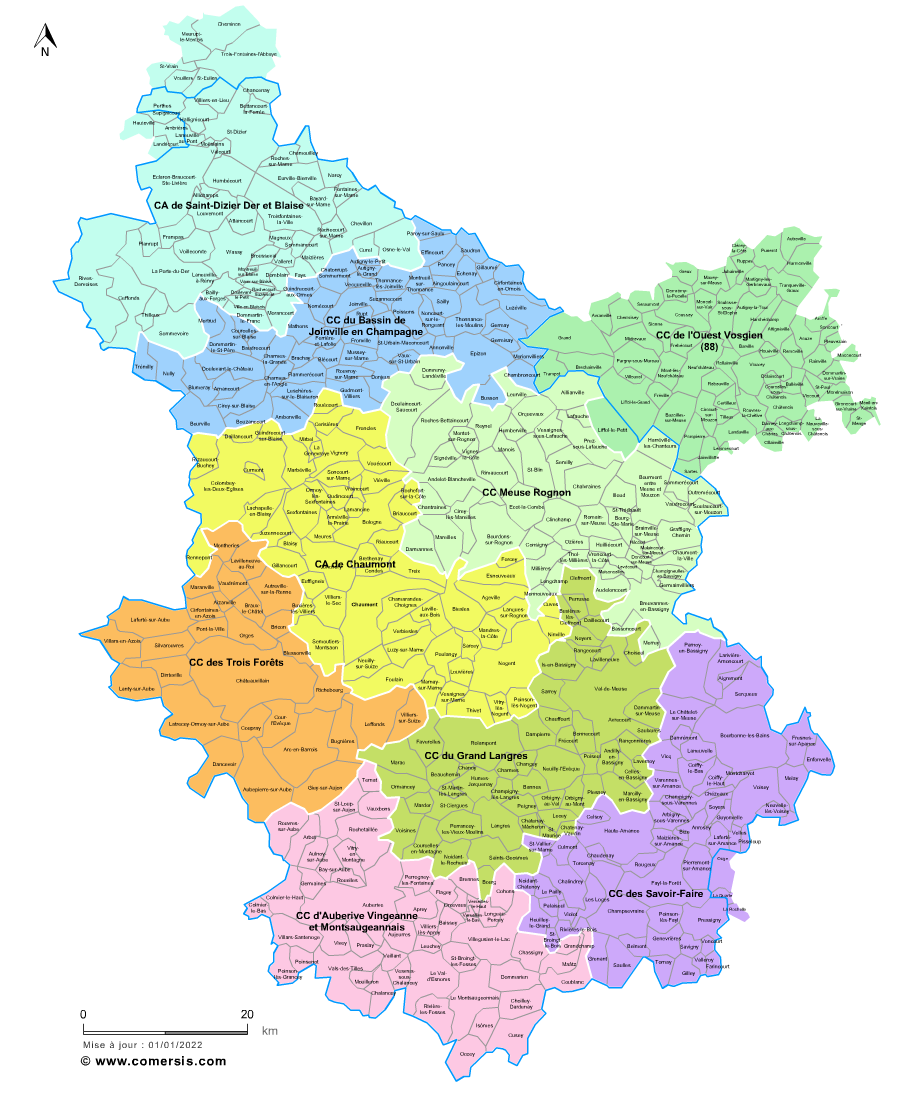 Carte administrative des communes et des 8 intercommunalités de la Haute-Marne pour l'infographie, l'édition et l'impression grand format.