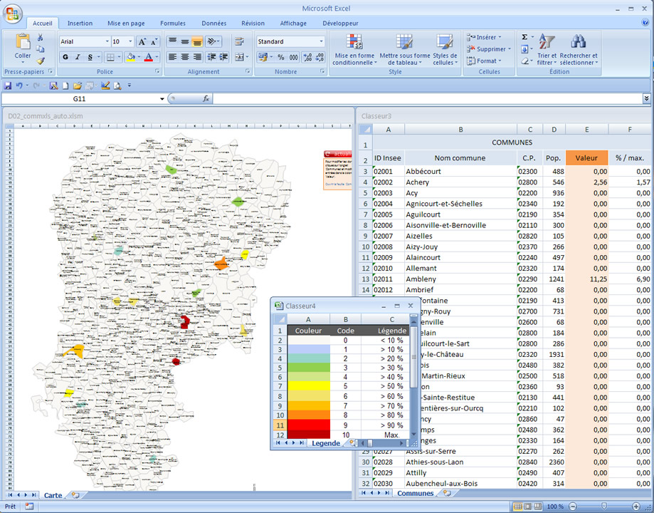 Grâce au logiciel Excel®, vous pouvez ainsi créer vos propres cartes thématiques, aide à la décision, rapports d'activité, sectorisation et visualiser immédiatement les variations d'une commune ou d'un groupe de communes à l'autre. Publier ensuite votre carte sous de nombreux formats tels que Acrobat PDF, page Html pour votre site, présentation PowerPoint®, document Word® ....