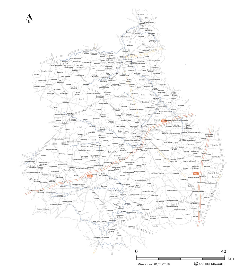 Carte vectorielle des routes d'Eure-et-Loir pour l'infographie, l'édition et l'impression grand format.