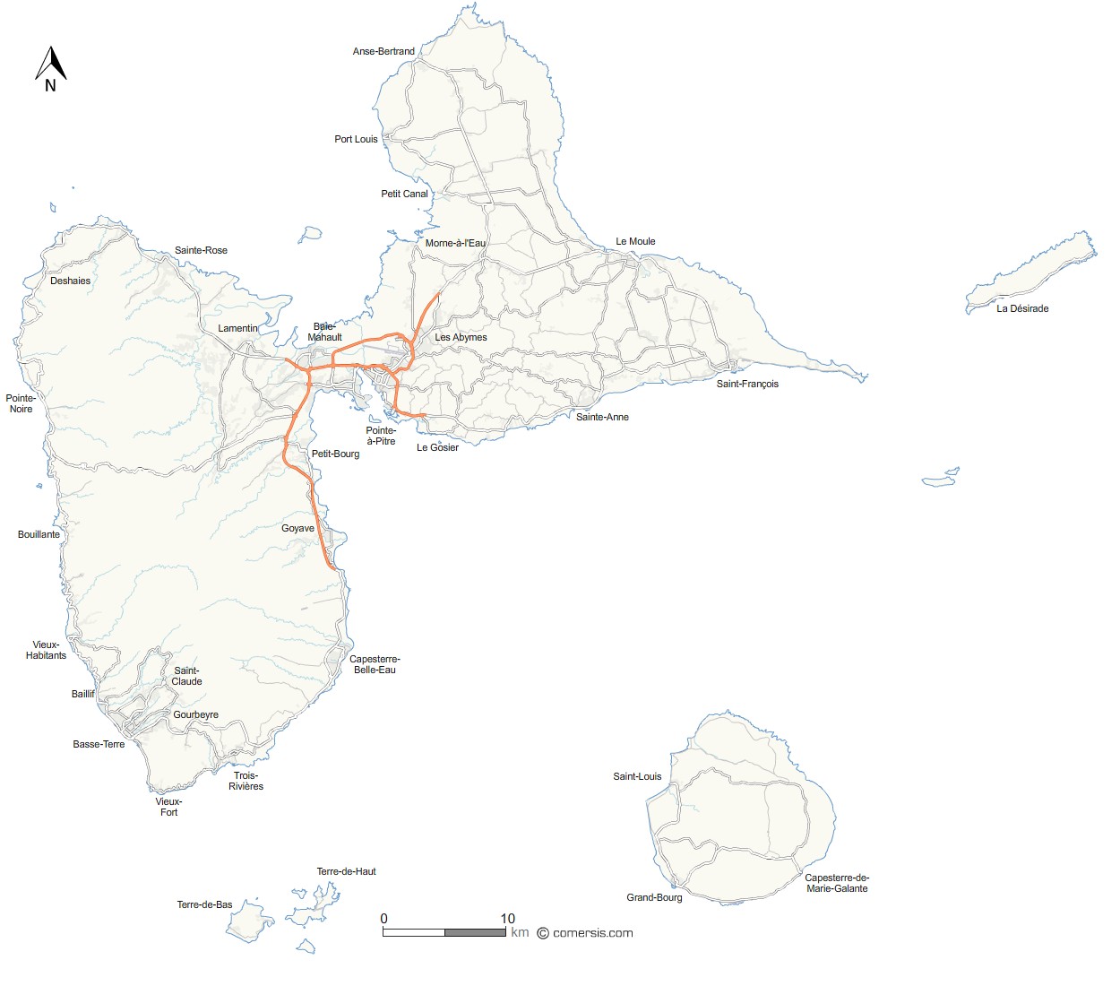 Carte vectorielle des routes de la Guadeloupe pour l'infographie, l'édition et l'impression grand format.