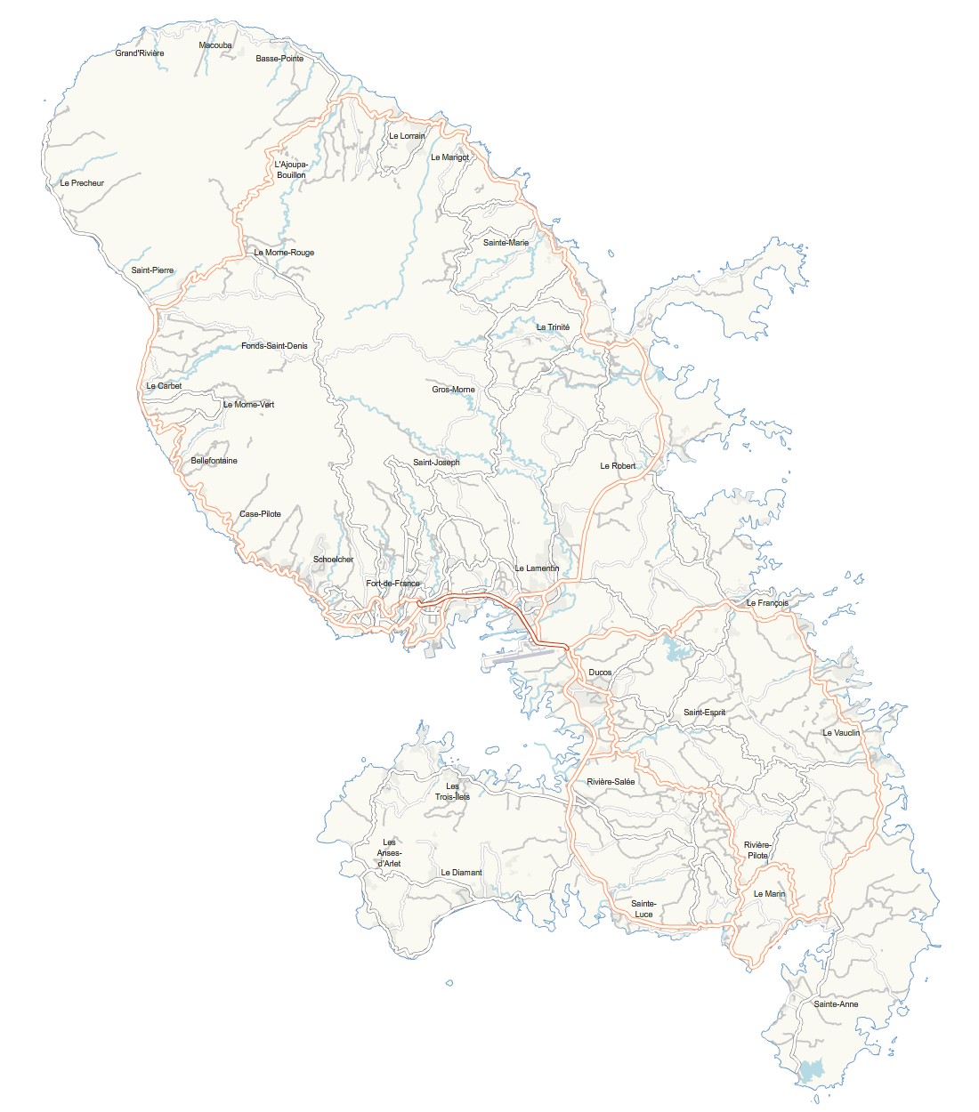 Carte vectorielle des routes de la Martinique pour l'infographie, l'édition et l'impression grand format.